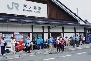 | 琵琶湖一周健康ウオーキング2025⑦ 10月19日(日) 曇り 135名 木ノ本駅~伊香具神社~賤ヶ岳リフト下広場~賤ヶ岳隧道~藤ヶ崎~塩津神社~道の駅あぢかまの里~岩熊第2トンネル入口 ~大浦口信号左折~JA北びわこ永原支店前信号~永原駅