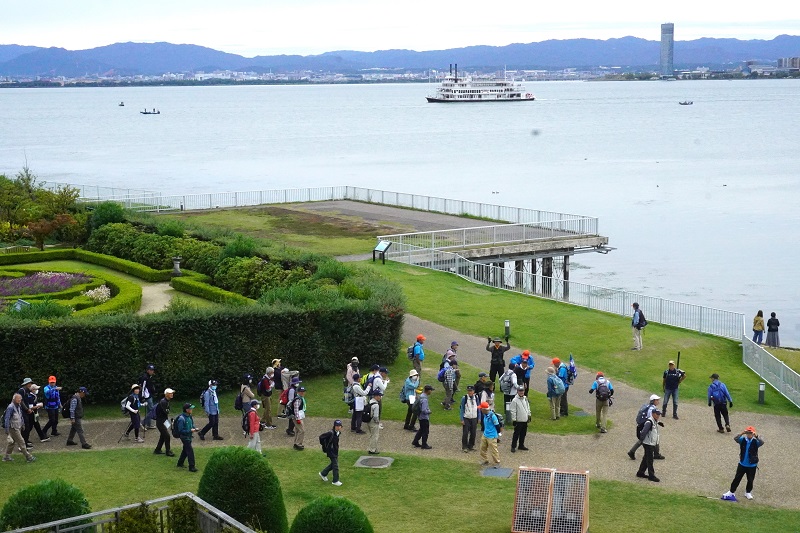 | 大津なぎさウオーク(新しい湖畔の風景と桜の名所を訪ねて) 2025年4月8日(日) 晴れ 122名 大津駅~お祭り広場~なぎさ公園~由美浜~サンシャインビーチ~膳所城址公園~松原~石山駅